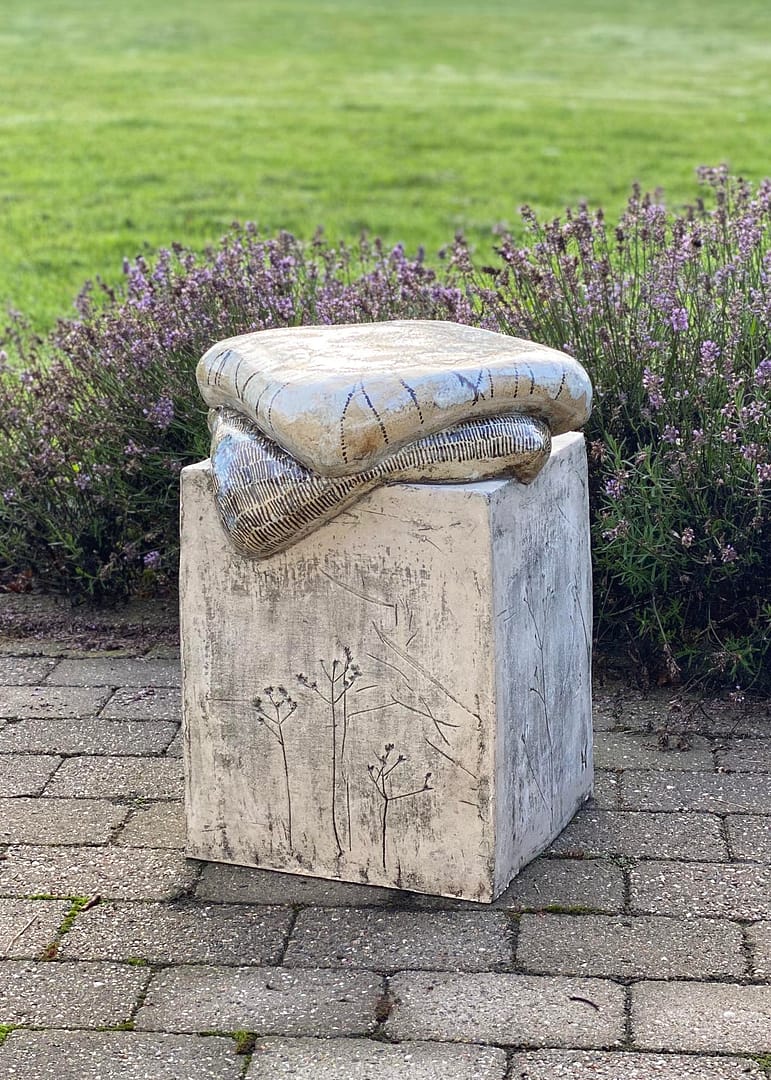 Lys brunlig oxyderet sokkel. Ovenpå er placeret en pude med blåt lyst labyrinth mønster.