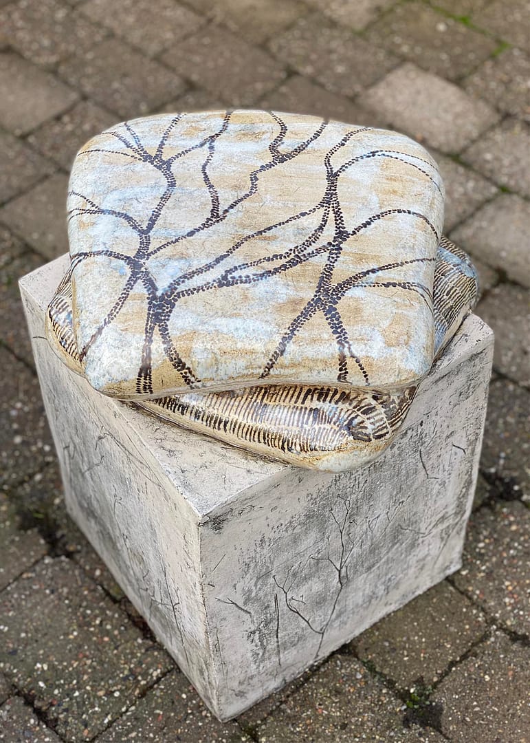 Dobbelt pude stol #23. Grafitgrå sokkel med oxideret trykt blade og blomster fra en Skimmia. Cirkel strukturmotiv på underpuden og en penselstribet streg på overpude glaseret i sortgrønne toner.