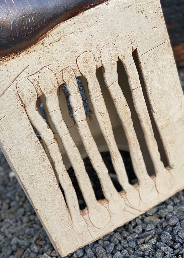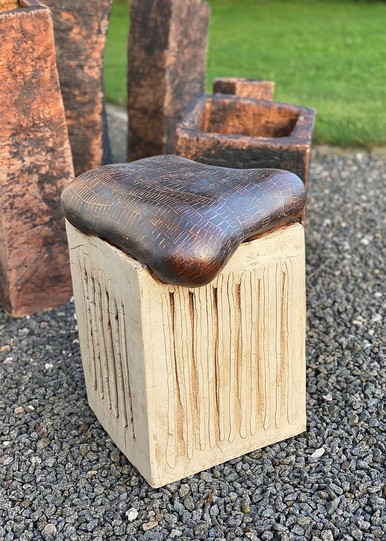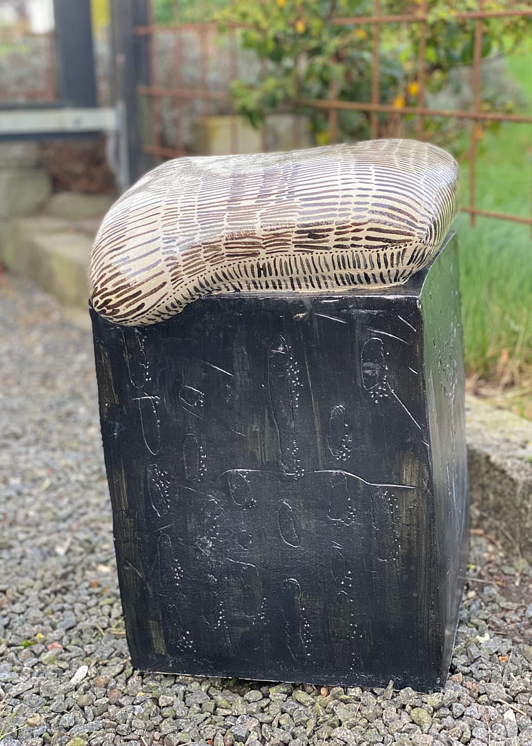 Brun oxyderet sokkel med flet struktur. Håndmalet strib på enkelt pude i sort/ecru.