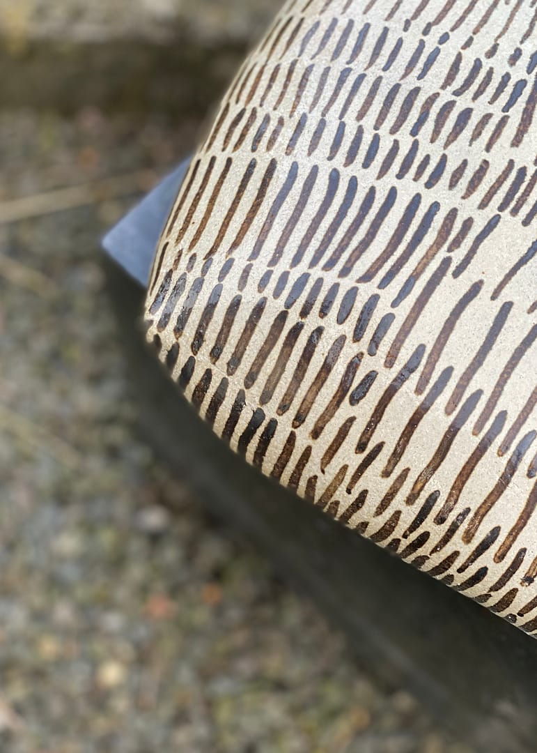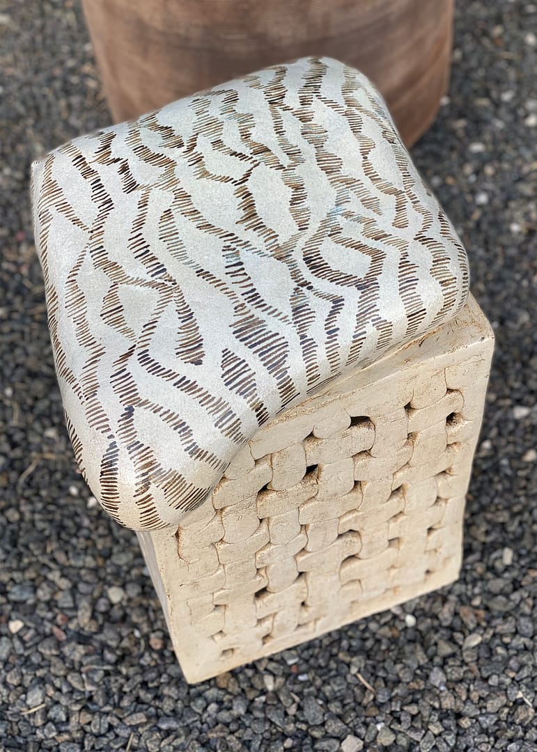 Lys sokkel med flet. Keramisk pude med stribet bark print.