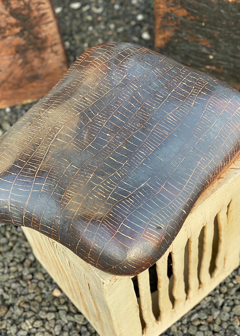 Siddeskulptur #18 Scarification. Lys oxyderet sokkel, med åbne paneler der giver lethed til formen. Puden har skåret ornamentik med inspiration fra stammefolkets skåret kropsdekorationer der giver mønstre ved ardannelse.