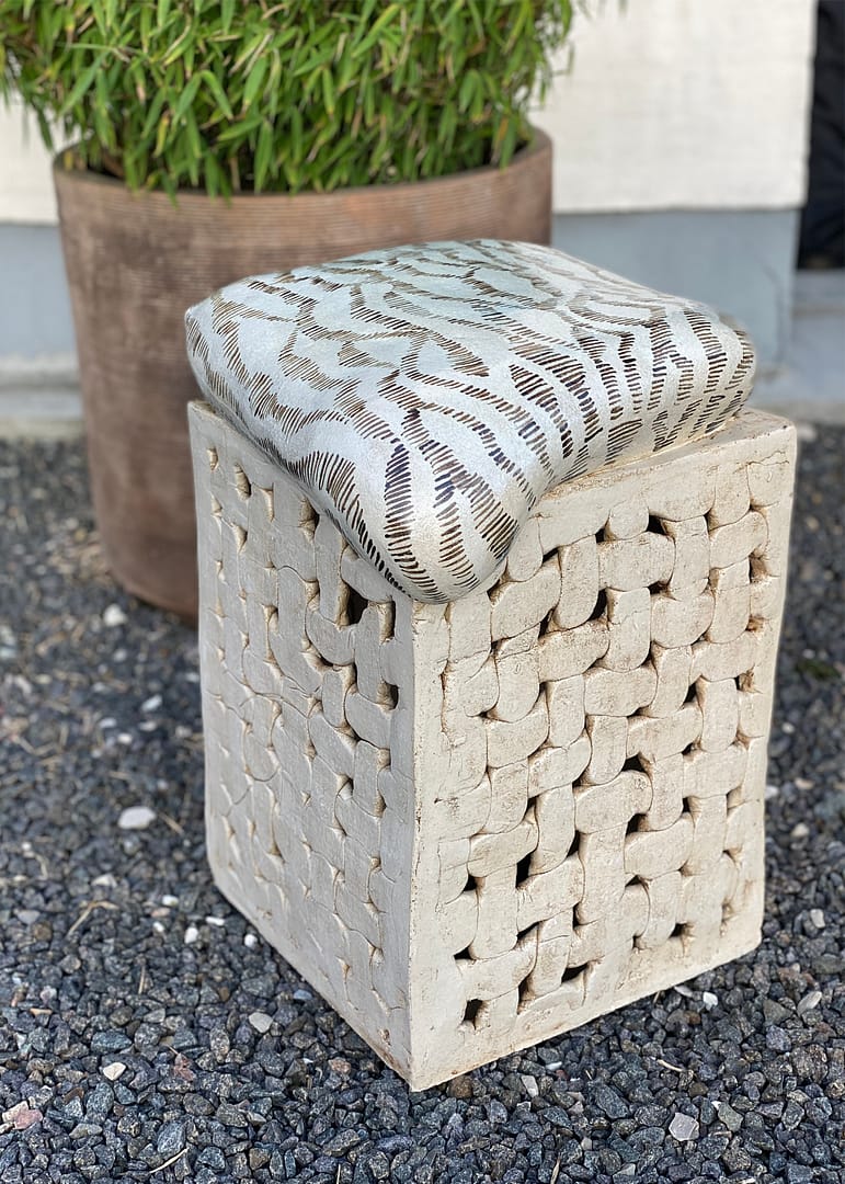 Lys sort oxyderet sokkel med plante motiv. Pude i lys ecru med skraveret striber.